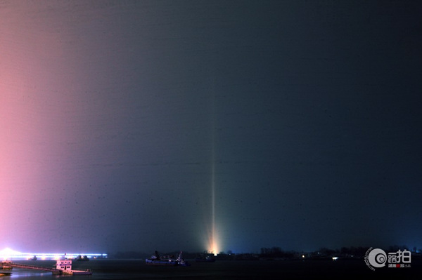 2月3日,夜幕之中,朝鲜新义州零星灯火,火车站照射金正日画像的灯光在远处形成一道光柱。