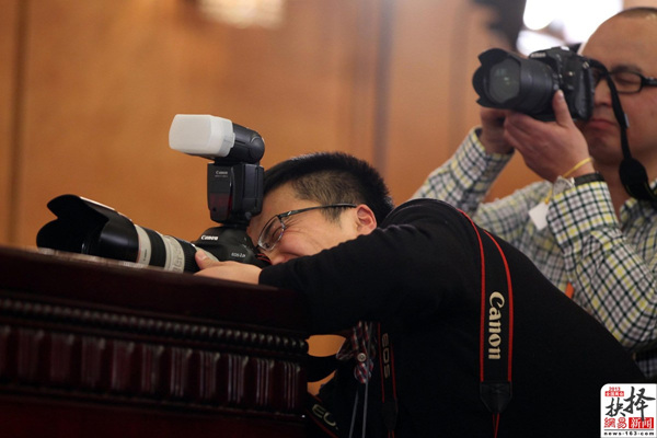 3月2日,政协新闻发布会上,一位记者趴在主席台边拍照。